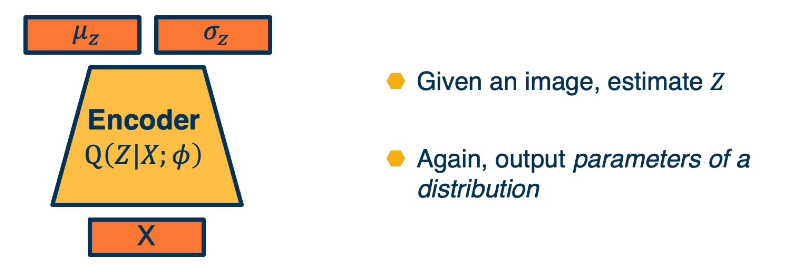 The problem still remains. How can we maximize the likelihood for this model? And it turns out that if we also have an encoder, then actually we’ll be able to derive some gradients that actually do quite well. In this case, we’ll have an encoder, where given an image will have Q of z given x with again, some new parameters ϕ. So this is a different model than the decoder. And again given x, it’ll output not a particular z but it will output the parameters of a Gaussian distribution mu and sigma. And if we wanna generate an actual z, we again just sample from this simpler Gaussian. So now we have both an encoder and a decoder. We can put the encoder and decoder together that is given real data. Again, the whole idea of all of these generative models is that we have samples from the distribution and we want a model P(X).